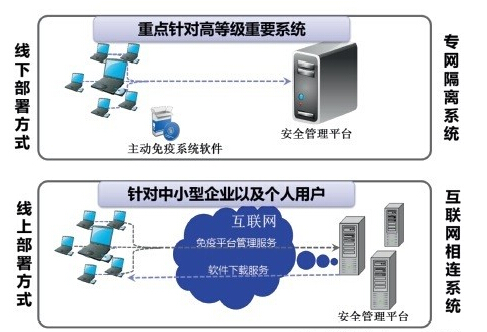 可信服务分为线下、线上模式(见图2 所示),其中除军队、政府和核心重要部门仍采用传统线下产品销售,由用户自行进行运维管理外,面对更多数的政府电子政务外网、中小企业,可提供托管模式,采用自建和共建的方式,由用户和安全厂商共同建立可信服务平台,由安全厂商进行运维管理,提供有偿的免疫服务。可信服务模式可以极大地减少中小企业的运营成本,节省政府采购支出。