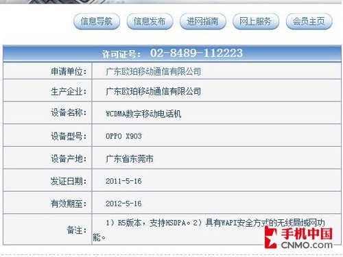 据悉这款我们关注已久的智能手机目前已经正式获得工信部认证的入网许可证,其型号被命名为OPPO X903。这款手机将支持WCDMA制式3G网络,并具备WAPI无线局域网功能。根据此前我们已知的消息,OPPO X903将搭载Android系统,拥有一块3.97英寸WVGA分辨率IPS材质触摸屏幕,这款屏幕支持多达10点触摸操控。