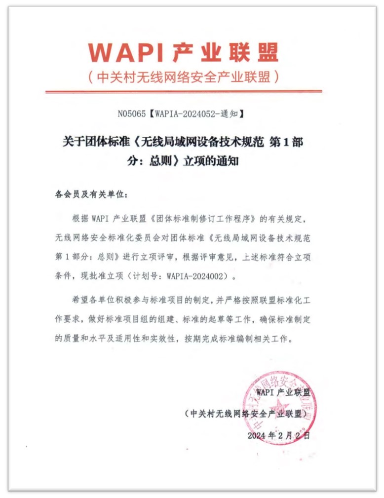 日前,经无线网络安全标准化委员会评审,WAPI产业联盟团体标准《无线局域网设备技术规范 第1部分:总则》正式立项。多家单位积极申请成为参编单位。