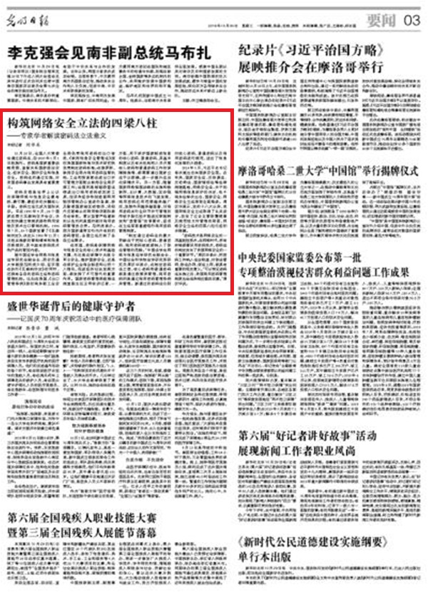 10月26日,全国人大常委会通过密码法,自2020年1月1日起施行。密码是国家重要战略资源,直接关系国家政治安全、经济安全、国防安全和信息安全。密码法的通过实施,对我国密码事业发展具有重要意义。